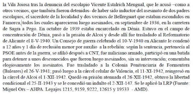 Natural de Famorca, vecino de Elche. Agricultor, de 24 años. Ingresó en el Reformatorio de Alicante el 14-III-1945, a disposición del Gobernador Civil, incomunicado, el 6-V pasó a la jurisdicción militar, que se inhibió el 23-V, salió en libertad el 15-VI-1945. Varias salidas a diligencias (Fuente: AHPA. Legajo 9069).